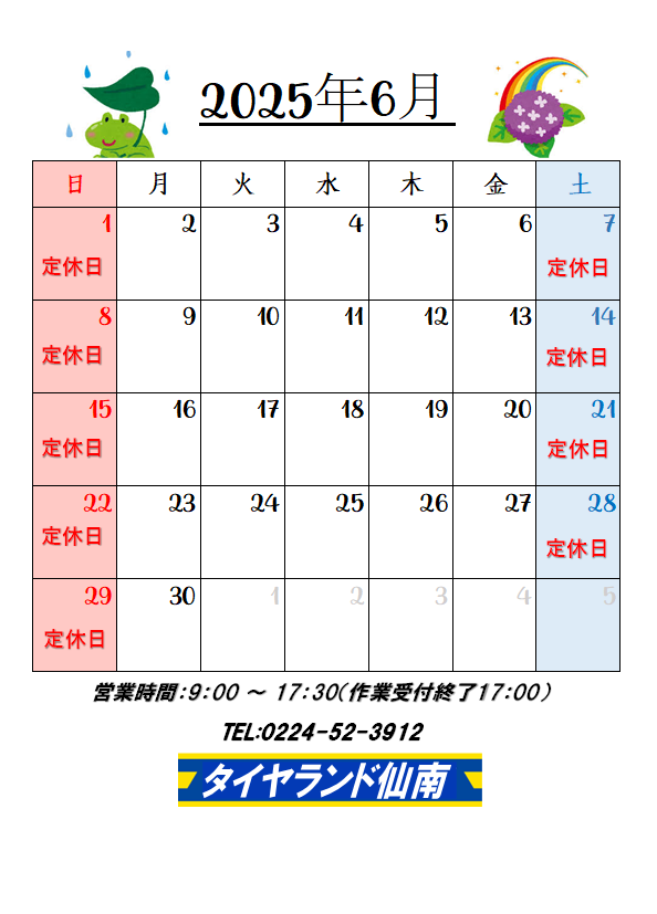 6月の定休日のお知らせです。 もう6月です。早いですねー。6月は梅雨入り。ジメジメがやってきちゃいますね。 梅雨入りは、ご存知の通り降水量が増えます。 雨天時はスリップ事故が多発します。原因は、すり...