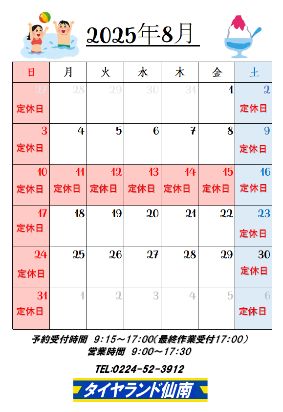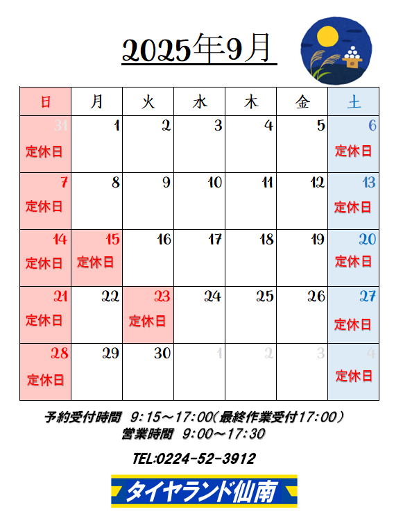 9月の定休日のご案内です。 暦の上では秋! とはいえ、まだまだ厳しい暑さが続いておりますね。夏の疲れが出やすい頃かと思いますので、皆さん体調管理、しっかりしていきましょう! 秋が過ぎれば、冬はもうすぐ! そ...