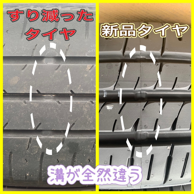 前回、すり減ったタイヤの画像を載せましたが、今回は『新品』と『すり減ったタイヤ』を見比べてみようと思います。