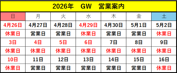 5月は土日休業日となっておりますのでお間違いないようお願いいたします。