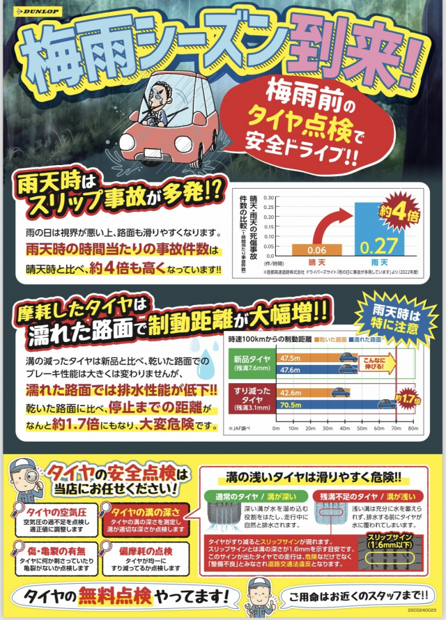 タイヤ点検も行っておりますので、梅雨入り前に点検しましょう!