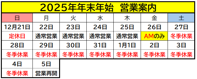 12月27日(土)~1月4日(日)の9日間を休業とさせていただきます!ご了承くださいm(_ _)m