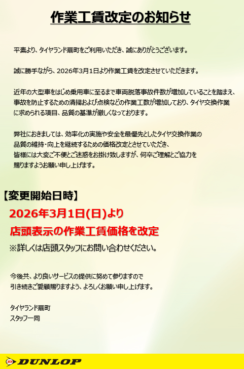2026年3月1日より作業工賃価格改定をさせていただきます。