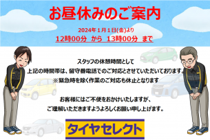 いつもタイヤランド扇町をご利用いただきありがとうございます。 タイヤランド扇町ではこの度「お昼休み」の時間を設けさせて頂きます。 時間は12:00から13:00までをお昼休憩の時間として 電話応対は留守番電話での...