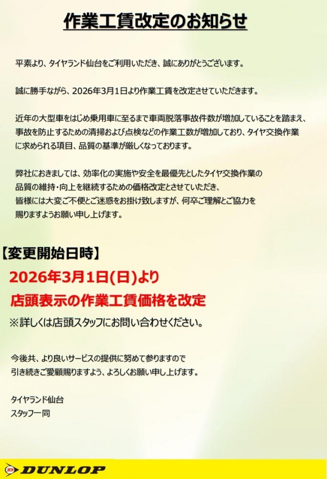 平素より、タイヤランド仙台をご利用いただき、誠にありがとうございます。 誠に勝手ながら、2026年3月1日より作業工賃を改定させていただきます。 近年の大型車をはじめ乗用車に至るまで車両脱落事故件数が増加してい...