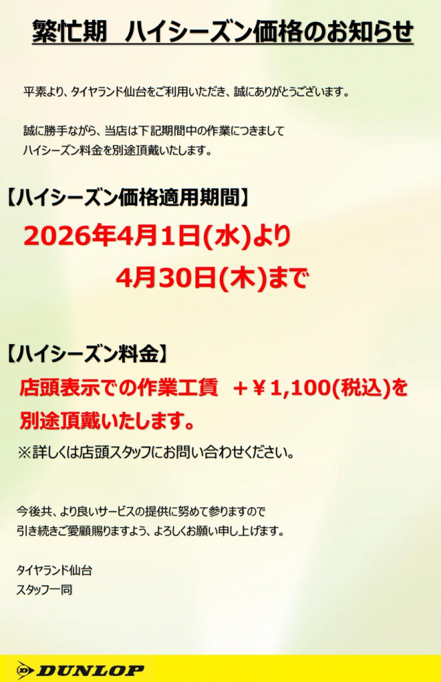 平素より、タイヤランド仙台をご利用いただき、誠にありがとうございます。 誠に勝手ながら、当店は下記期間中の作業につきまして ハイシーズン料金を別途頂戴いたします。 【ハイシーズン価格適用期間】 2026年...
