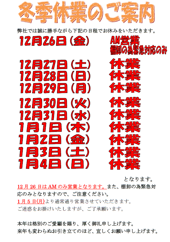 遅くなりましたが、冬季休業のお知らせです。 当店では画像の通りお休みを頂きます。 12月26日はAM営業となり 年始は1月5日より営業となります。 ご迷惑をおかけ致しますが、ご了承のほどお願いいたします。