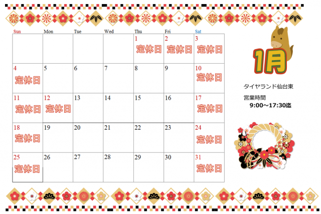 1月のカレンダー掲載です。 土曜は全て定休日となります。 その他日祝もお休みとなりますので、ご注意ください。 1月も皆様のご来店お待ちしております。