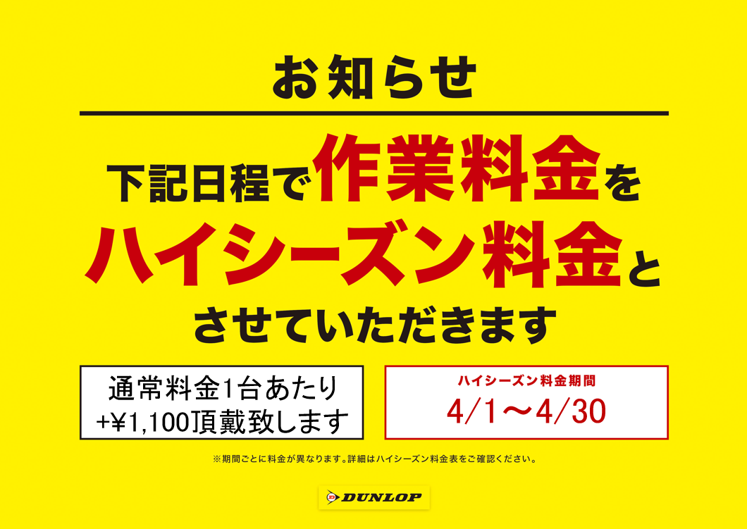 ハイシーズン料金のお知らせ 2026年4月1日(水)から2026年4月30日(木)までの期間 作業料金をハイシーズン料金とさせていただきます。 通常料金1台あたりプラス¥1,100円頂戴致します。 2026.03.17