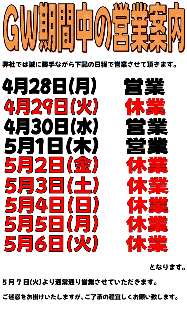 GW期間中の営業についてのご連絡です。