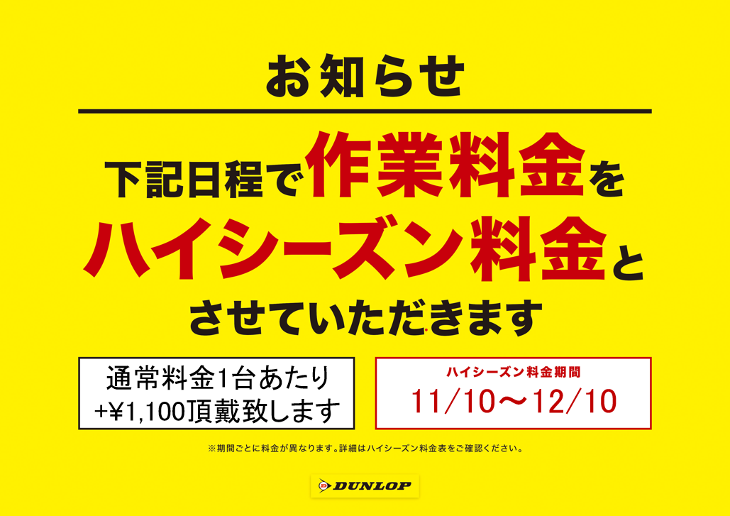 ハイシーズン料金のお知らせ 2025年11月10日(月)から2025年12月10日(水)までの期間 作業料金をハイシーズン料金とさせていただきます。 通常料金1台あたりプラス¥1,100円頂戴致します。 2025.10.20