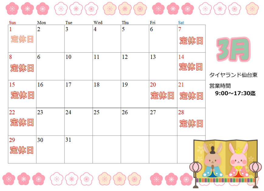 3月も土曜日は全てお休みとなります。