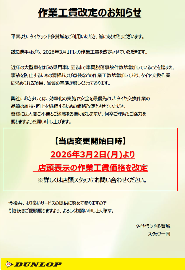 いつも当店をご利用頂きまして 誠にありがとうございます。 当店では、3月2日(月)より、作業工賃の改定をさせて頂く事となりましたので ご案内いたします。 今後共、より良いサービスの提供に努めて参りますので 引き...