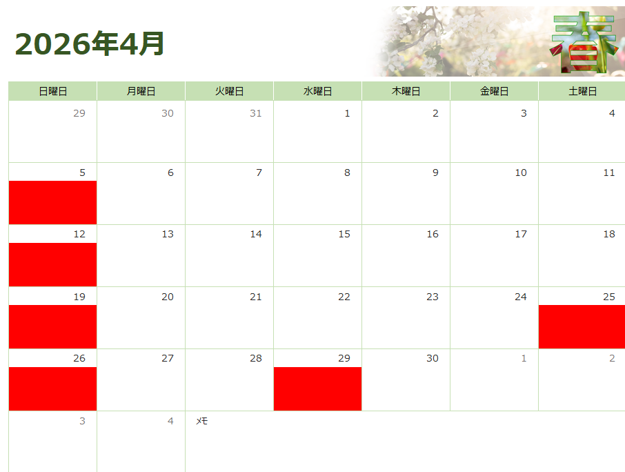 4月の休業日のご案内です。