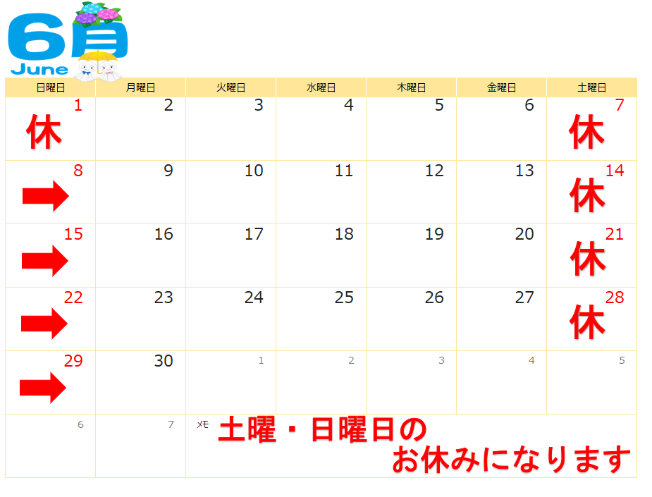 6月 休業日のお知らせ いつもお世話になっております。タイヤランド古川です。 今回は、6月の休業日の案内になります。 土曜・日曜のお休みになります。 皆様のご来店お待ちしております。 2025.05.29