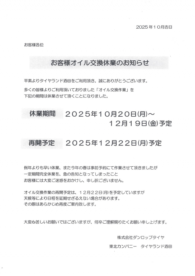 いつもタイヤランド酒田をご利用頂きありがとうございます。 10月14日(火)・17日(金) 20日(月)~12月22日(月)再開予定 オイル交換作業をお休みさせて頂きます。 またオイル交換作業の休業日が追加...