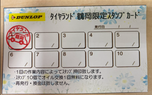 みなさんこんにちは! タイヤランド鶴岡です(^^)/ タイヤランド鶴岡では当店のみで使える スタンプカードがあります!! タイヤ購入、タイヤ交換、オイル交換、用品購入などで ポイントが貯まり、全部貯まるとオイル交...