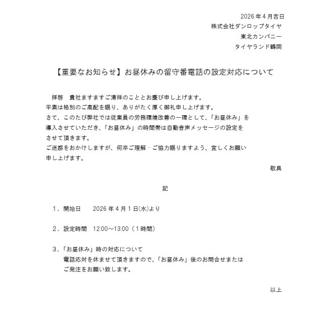 みなさんこんにちは! タイヤランド鶴岡です(^^)/ 今までも営業時間外に留守番電話サービスを設定 していましたが、4月1日よりお昼休憩時の12:00~13:00も 留守番電話使用させていただきますm(__)m ご迷惑をお掛け...