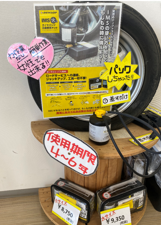 急なパンクに備えてIMSを車に搭載することをおすすめしています!