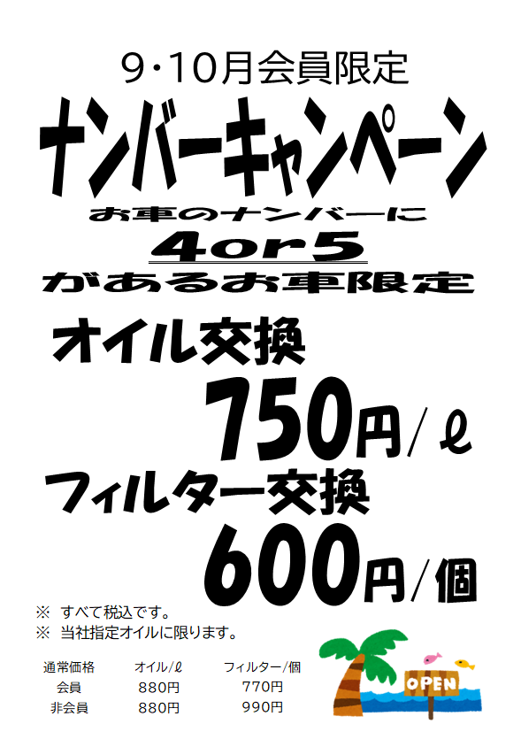 9月からのオイル交換ナンバーキャンペーンのお知らせです!!