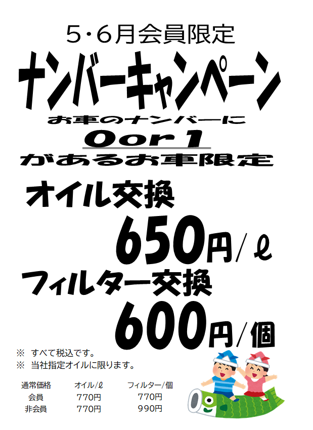 みなさんこんにちは! タイヤランド鶴岡です!(^^)! 明日から5月ですね~(^^)/ 5月.6月のナンバーキャンペーンのお知らせです☆ 車のナンバーに0.1がある方はお得にオイル交換出来ちゃいます!! ぜひナンバー確認してお...