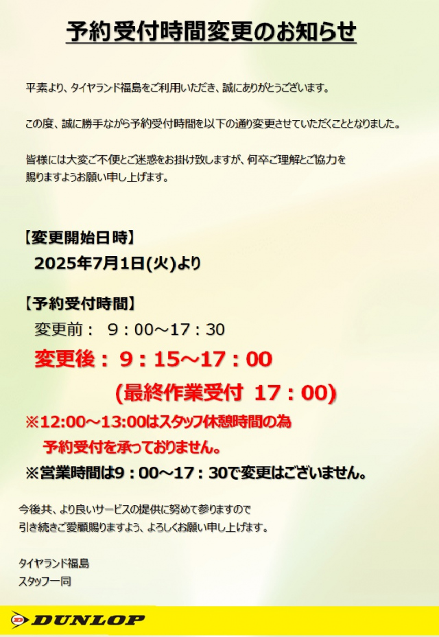 こんにちは。タイヤランド福島です。 いつもホームページをご覧いただきありがとうございます。 本日は予約受付時間変更のお知らせです。 2025年7月1日(火)より以下通り予約受付時間を変更いたします。 皆様には大...