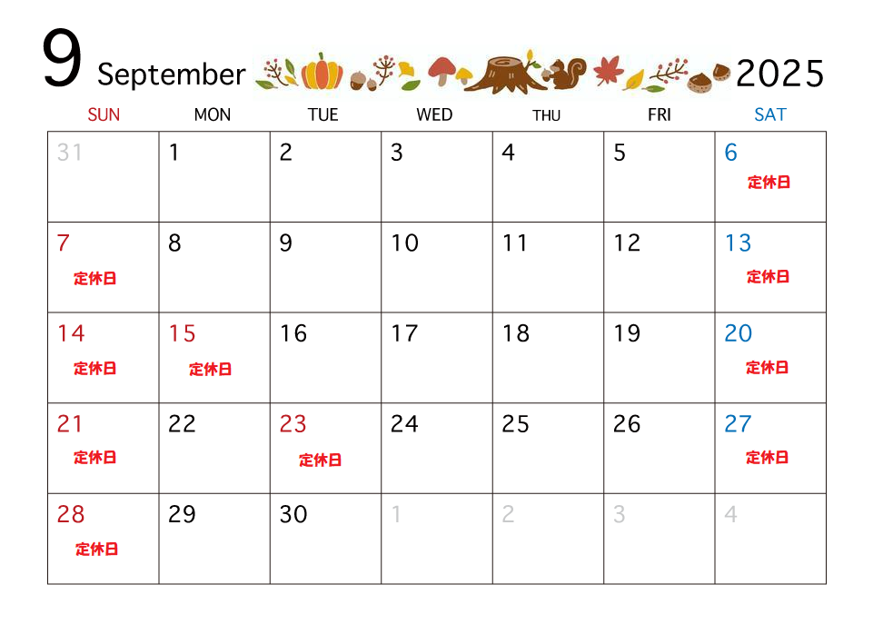 9月の定休日のお知らせです! 土曜日もお休みになっていますので、ご来店の際はご注意下さい☆