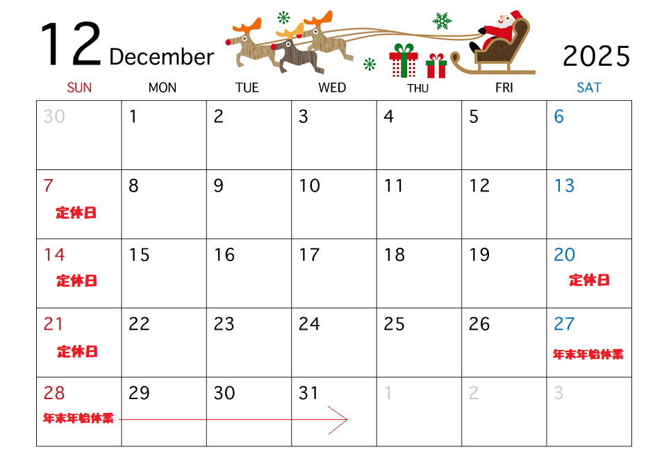 12月の定休日のお知らせです! 今年も残すところあと1か月となりました(^_^) 月の後半はお休みもありますので、ご来店の際はお気を付けください☆