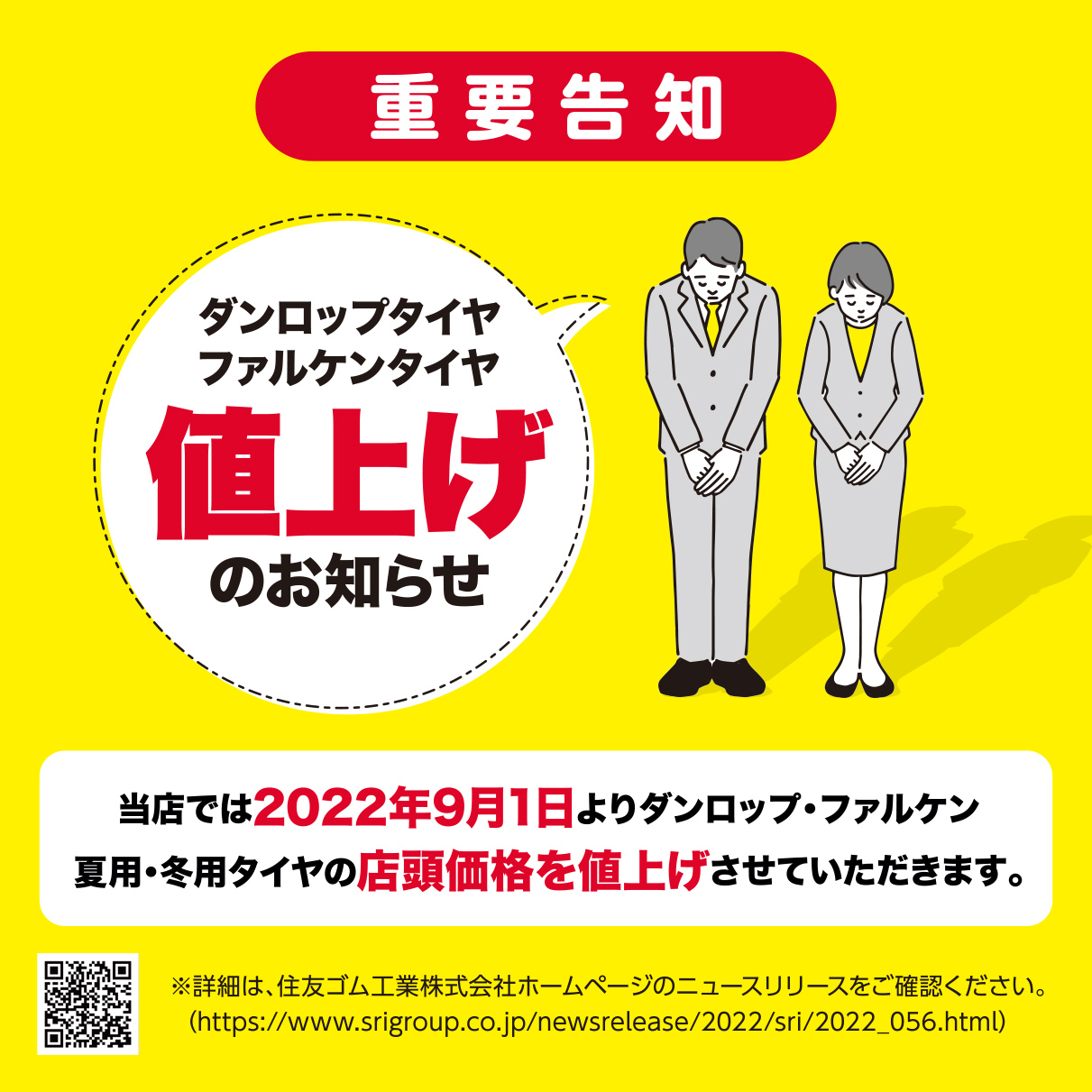 当店では、9月1日よりダンロップ・ファルケンの夏用・冬用タイヤの店頭価格を値上げさせていただきます。