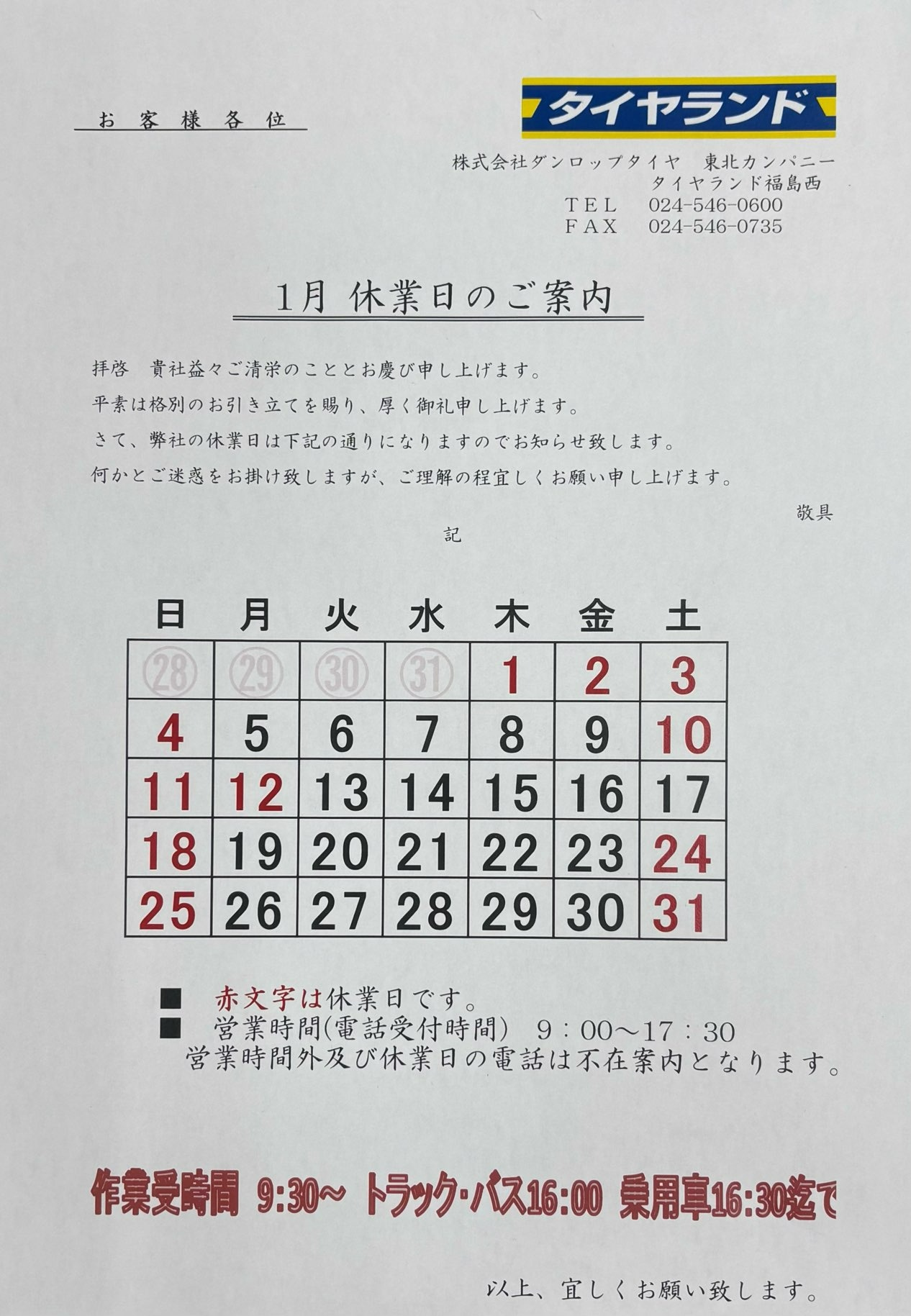 1月定休日のお知らせ
