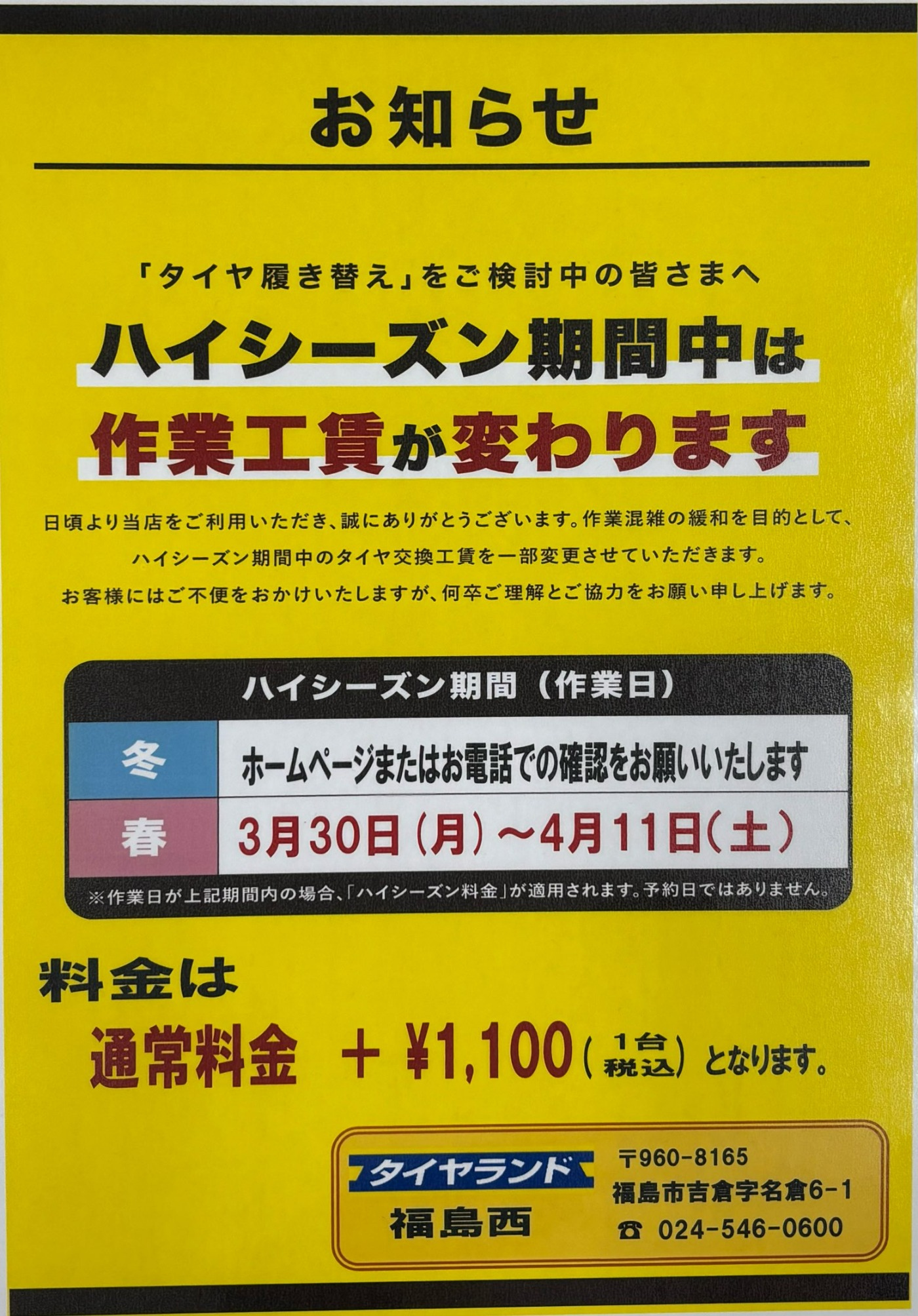 3/30~4/11は通常料金に+1100円となります。