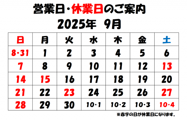 いつもお世話になっております。タイヤランド郡山です。 9月の定休日のお知らせをいたします。 9月は下記の通り 第2第4土曜日の13日27日、祝日の15日23日も休業日となっております。 6日 20日の土曜日は営業しておりま...