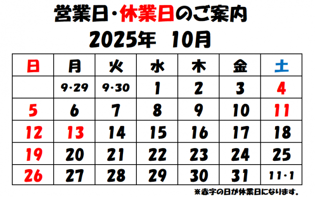 いつもお世話になっております。タイヤランド郡山です。 10月の定休日のお知らせをいたします。 10月は下記の通り 第1第2土曜日の4日11日、祝日の13日が休業日となっております。 第3第4土曜日の18日25日、11月1日土曜...