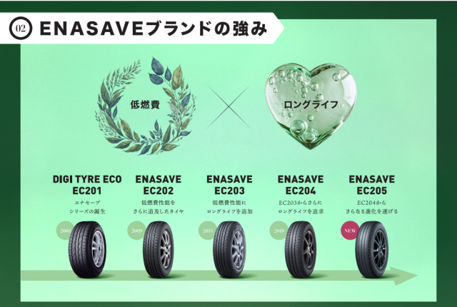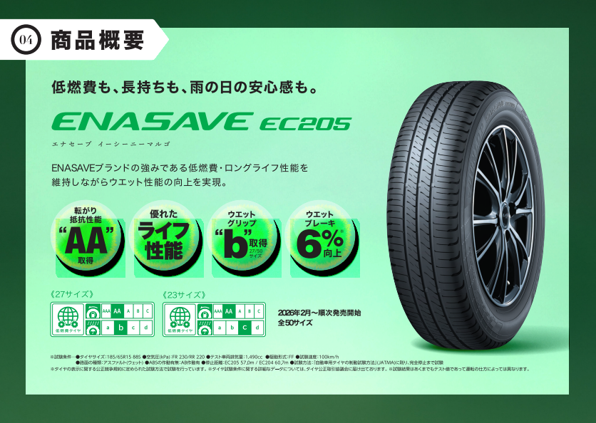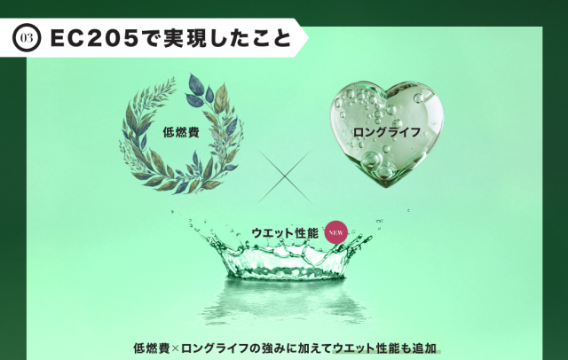 前作のEC204 は『低燃費』『ロングライフ』と2つの性能を持っていたのですが、EC205 はさらにウエットグリップ性能も追加され、雨の日もさらに安心して使用できます!!