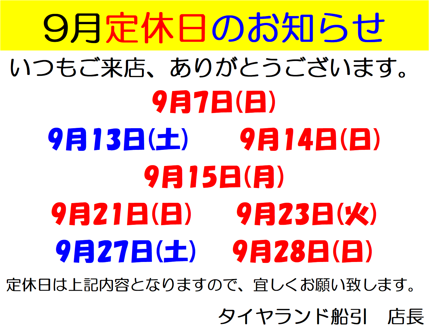 9月定休日のお知らせ