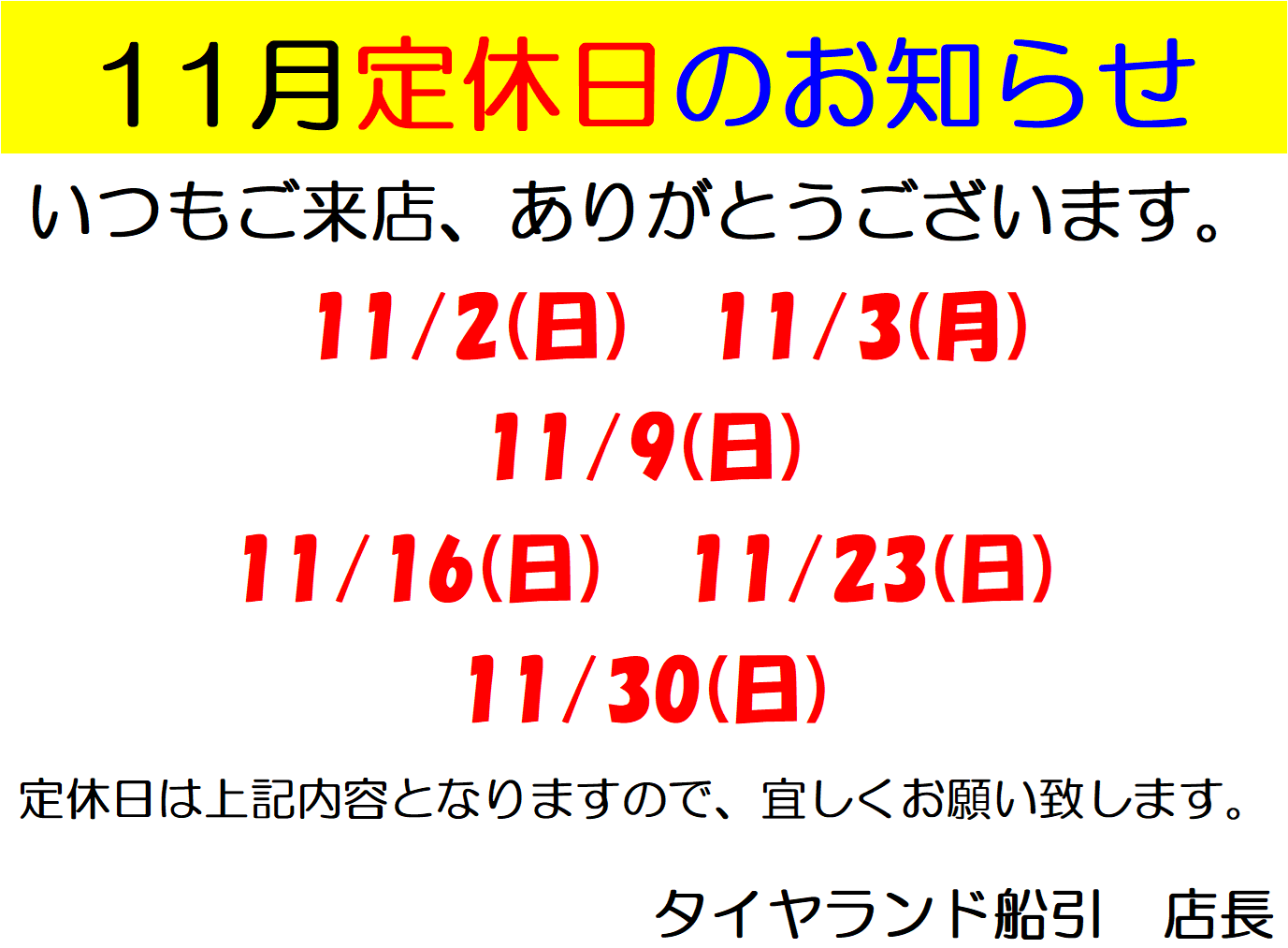 ⇩11月定休日のお知らせ ※11/24(月)は営業日となります