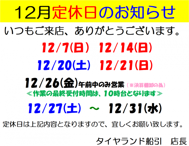 ⇩12月定休日のお知らせ ※年末年始の休業につきましては、別途案内させていただきます
