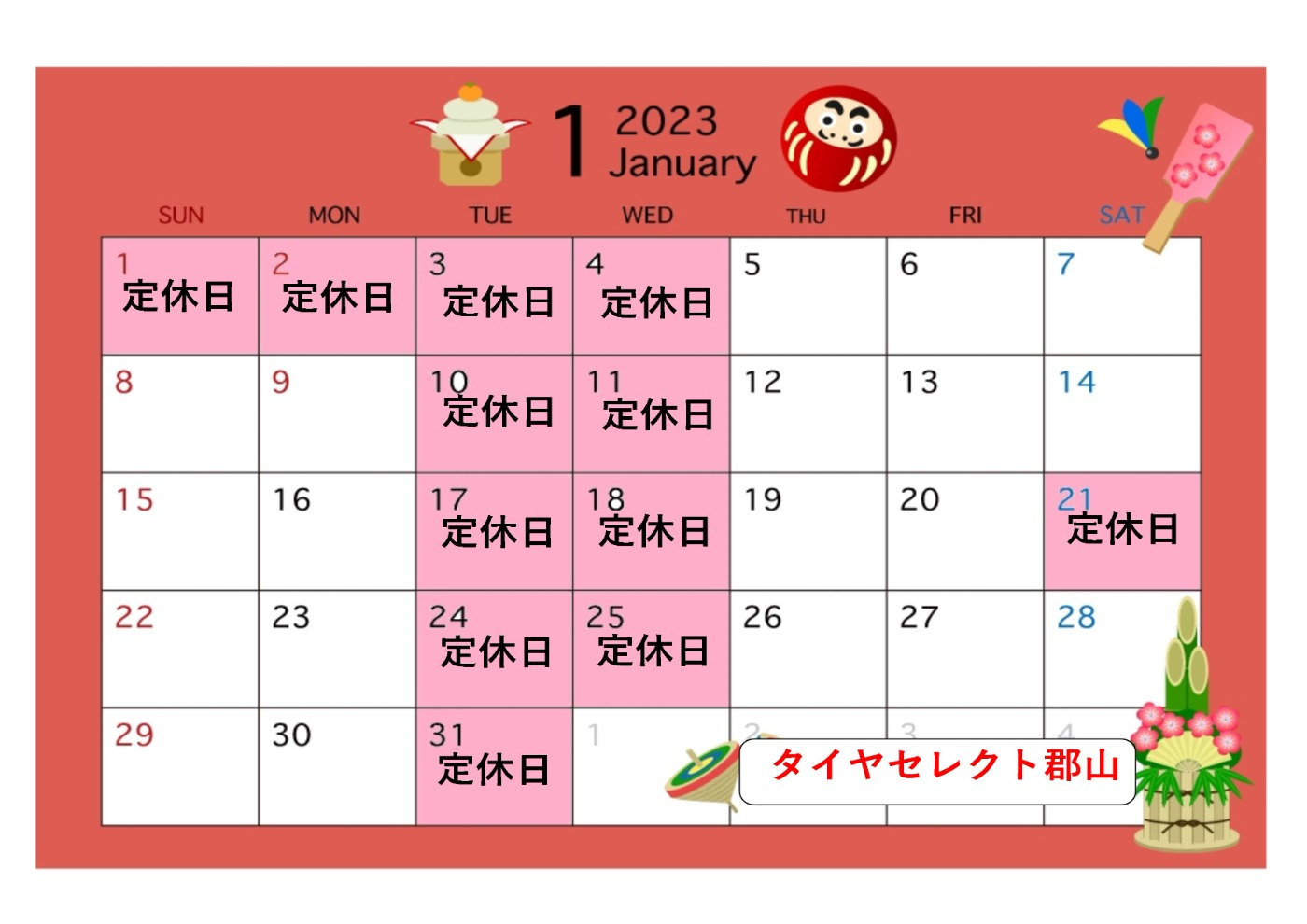 年末年始・1月定休日のお知らせです。
