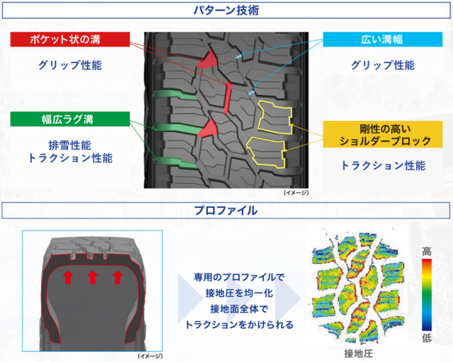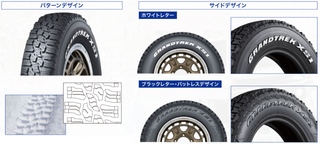 オフロードライクなパターンと、アグレッシブなデザインかホワイトレターを裏表で選べる2種類のサイドデザインを採用し同時に深雪や氷上路面においても優れたグリップ性能とトラクション性能を発揮します。