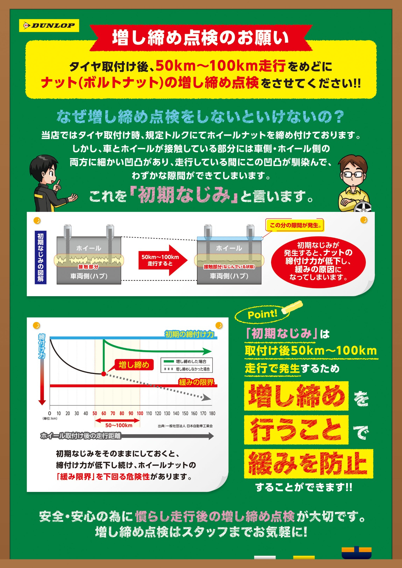 タイヤ交換後の増し締めは必ず行うようにお願いします。
