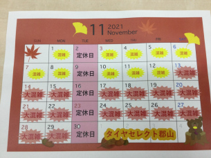 みなさん、こんにちは(^^)/ 最近は気温が一気に下がって、もうそろそろ冬なんだなと感じております… 気温差が大きいので体調管理に気を付けてくださいね! 11月定休日のお知らせです。 タイヤ交換時期になりますの...
