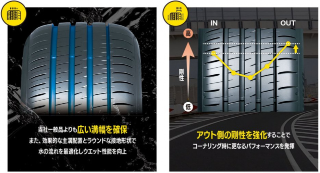 タテに走る太い溝が「水はけ」を促し、ウェット性能を高め