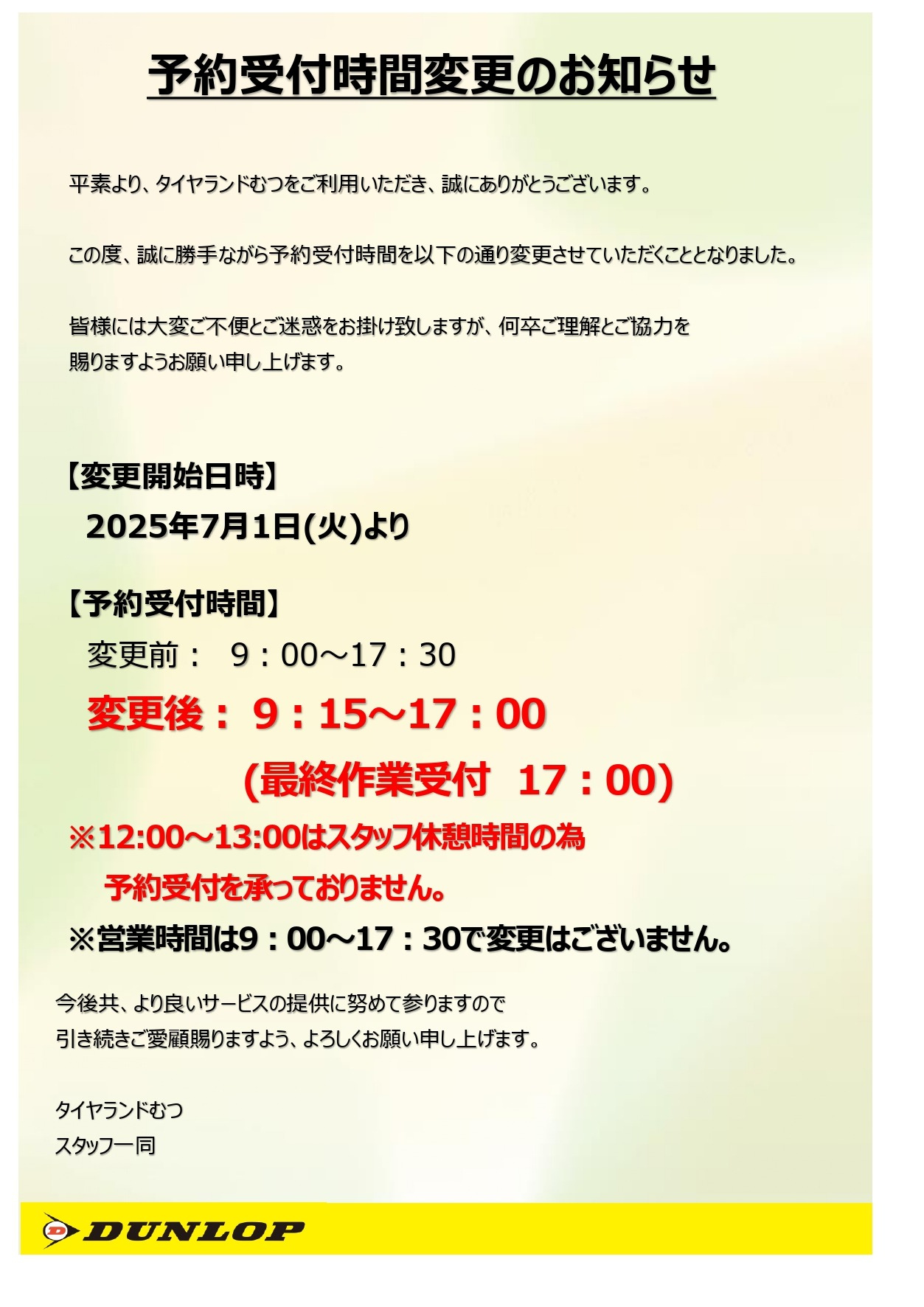 先日もご案内致しました作業受付時間変更のお知らせです。 お客様にはご迷惑お掛け致しますが、何卒宜しくお願い致します。