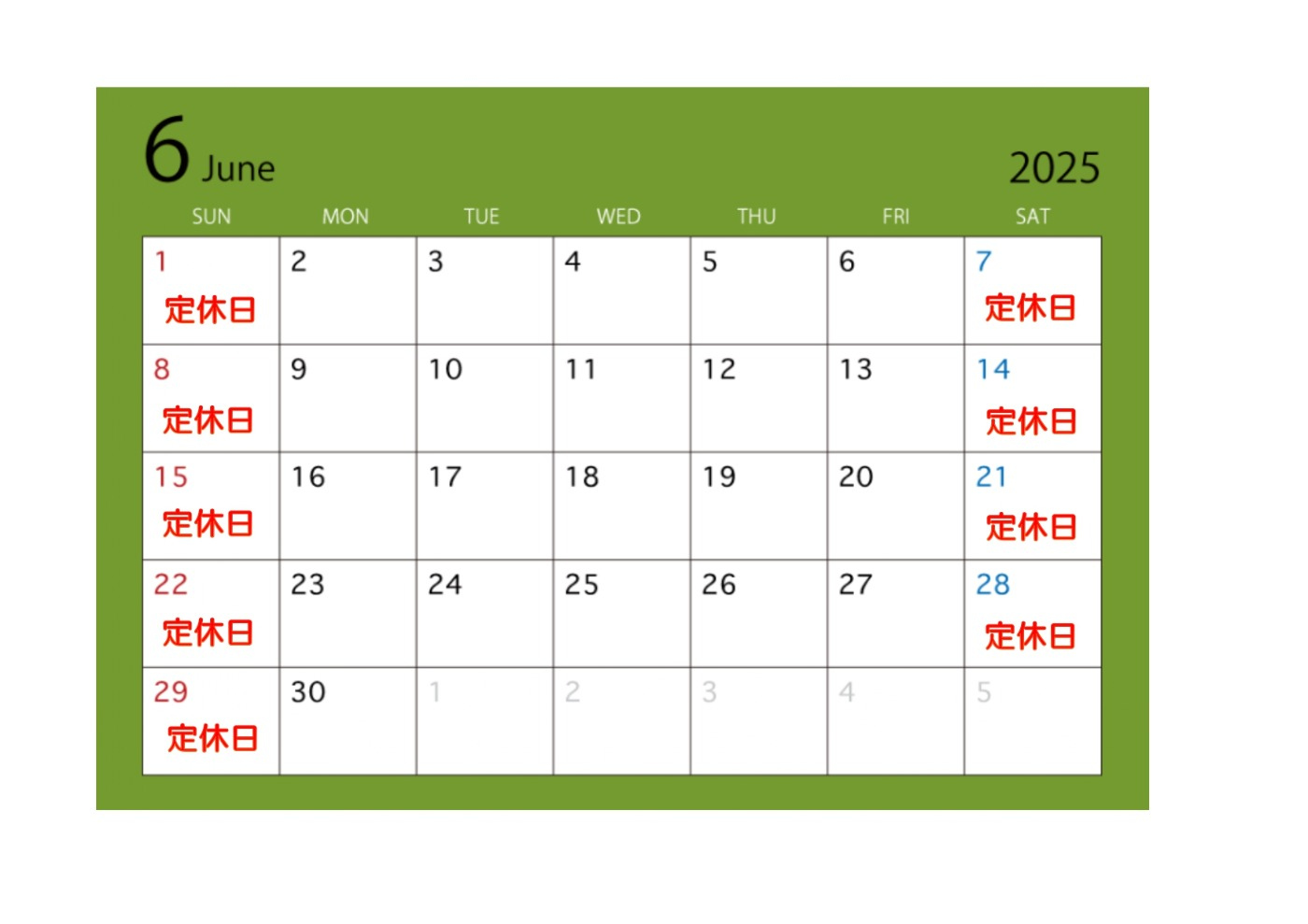 【6月定休日のご案内】 6月定休日をご案内します。 土曜・日曜日が全て休みとなりますのでカレンダーをご確認ください。 空気圧点検は無料ですので、遠出外出の前でもお気軽にお立ち寄りください。 皆さまのご来店をお待ちしております。 2025.06.02