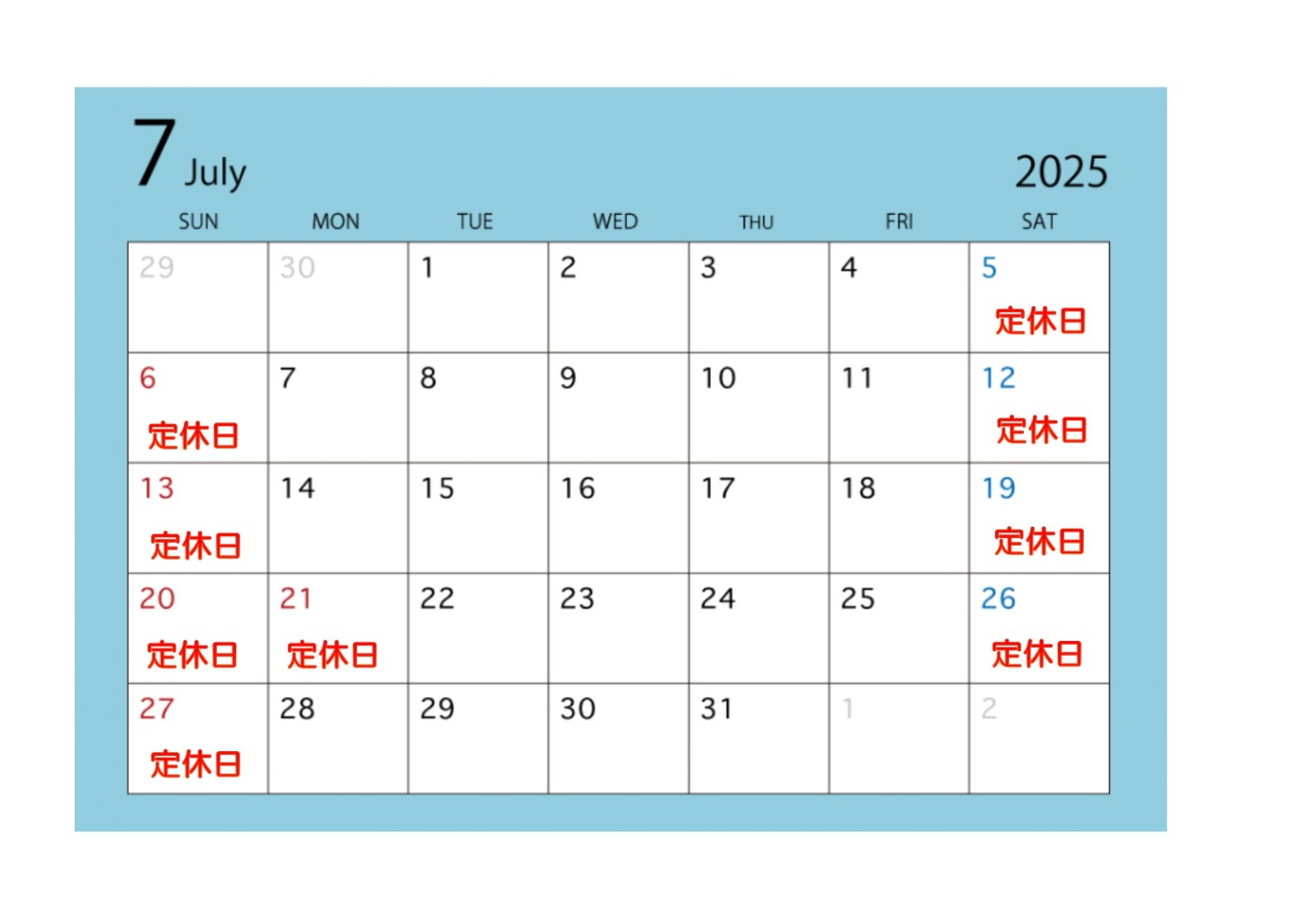 【7月定休日のご案内】 7月の定休日をご案内します。 土曜・日曜・祝日が休みとなりますので、作業のご予定がある方は事前に予約をお願いします。 ご不便をお掛けしますが、ご理解のほどよろしくお願い申し上げます。 2025.07.01
