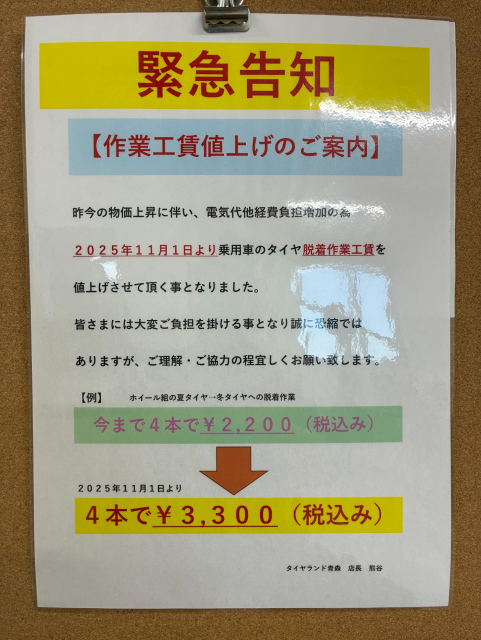 皆様こんにちは! スタッドレスタイヤの準備はお済でしょうか? 11月1日よりタイヤ脱着作業料を値上げさせて頂きます。 皆様には誠に恐縮ではございますがよろしくお願い申し上げます。