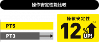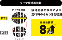 一つ前のタイヤPT3と比較して操縦安定性が上がり、またタイヤ接地面もPT3より上がりました。