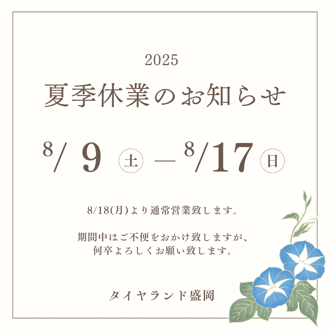 夏季休業のお知らせ こんにちは!タイヤランド盛岡です! 誠に勝手ながら、下記の期間を夏季休業とさせていただきます。 8/18(月)より通常通り営業いたします。 ご不便をおかけいたしますが、何卒ご理解のほどよろしくお願いいたします_(._.)_ 2025.07.22
