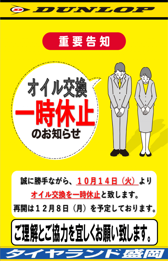 誠に勝手ながら、タイヤ交換繁忙期にはオイル交換作業を一時休止させていただきます。