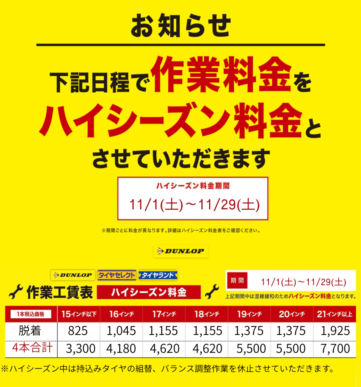 誠に勝手ながら今年から、タイヤ交換の繁忙期にあたる時期は「ハイシーズン料金」を設けさせていただくことになりました。